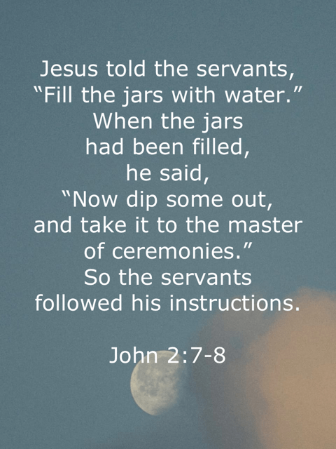 “Jesus told the servants, “Fill the jars with water.” When the jars had been filled, he said, “Now dip some out, and take it to the master of ceremonies.” So the servants followed his instructions.”