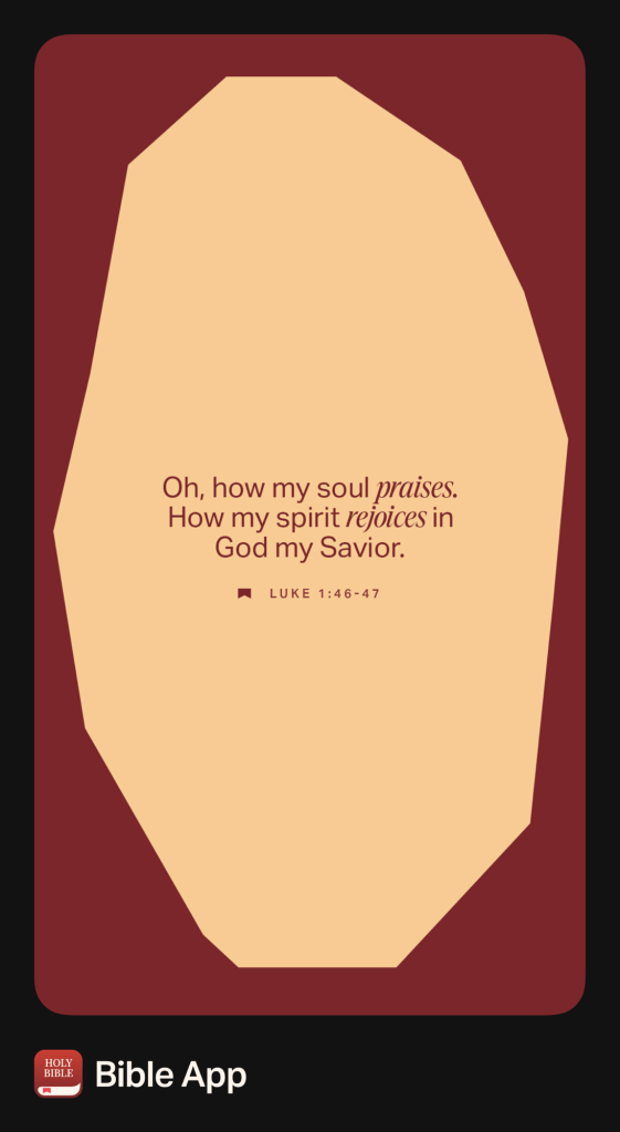 “Mary responded, “Oh, how my soul praises the Lord. How my spirit rejoices in God my Savior!”